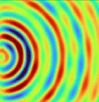 Работа посвящена нейросетевому приближённому решению 2D уравнения Гельмгольца в неоднородной среде. Поле аппроксимируется Kolmogorov–Arnold Network (KAN). Для устранения сингулярности точечного источника используется разложение (U=U_0+u) и условие Зоммерфельда на границе. Показано качественное совпадение с эталонным численным решением.